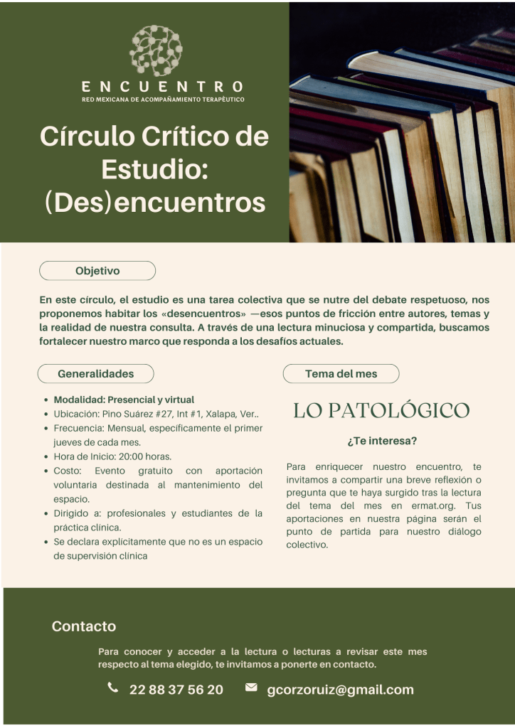 El Círculo Crítico de Estudio: (Des)encuentros es una invitación para sumergirnos en la profundidad de diversos textos, no buscamos memorizar conceptos de forma pasiva, sino diseccionarlos y permitir que sus tensiones nos interroguen; en este círculo, el estudio es una tarea colectiva que se nutre del debate respetuoso, nos proponemos habitar los «desencuentros» —esos puntos de fricción entre autores, temas y la realidad de nuestra consulta— para encontrar ahí nuevas herramientas de pensamiento. A través de una lectura minuciosa y compartida, buscamos fortalecer nuestro marco que responda a los desafíos actuales de la salud mental en nuestra comunidad.